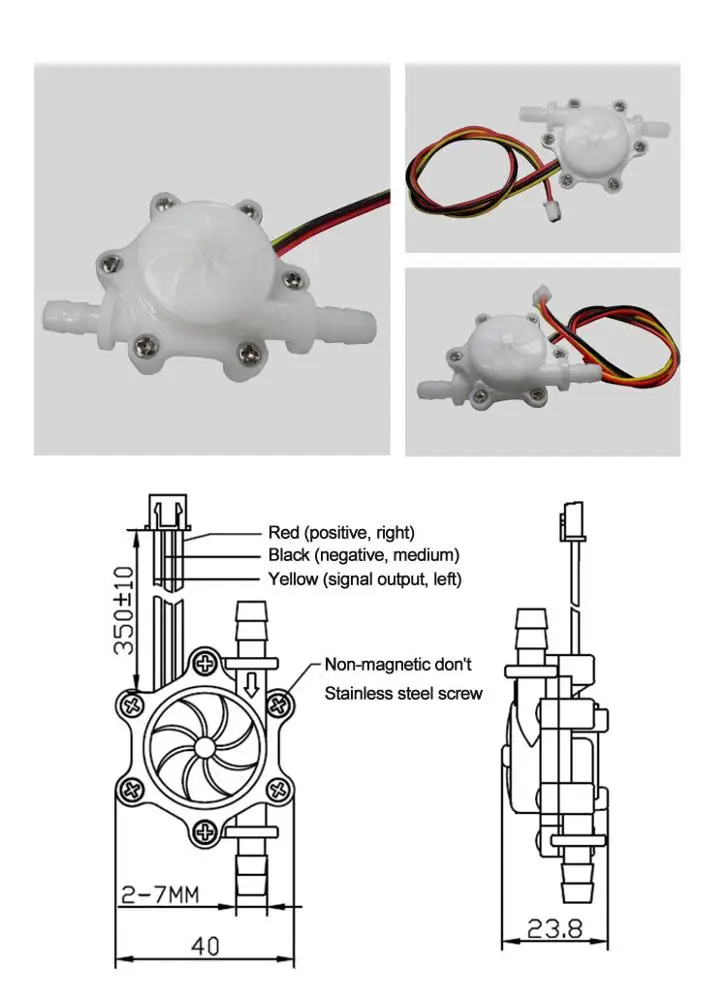 The water flow sensor mainly consists of a plastic valve body, a water flow rotor assembly and a Hall element. It is installed at the inlet of the measuring device (such as water heater, wall-hung boiler, water dispenser, water purifier, etc.) for detecting the influent flow. When the water passes through the water-flow rotor assembly, the magnetic rotor rotates and the rotational speed changes with the flow rate. The Hall element outputs a corresponding pulse signal, which is fed back to the controller, and the controller determines the magnitude of the water flow and performs regulation.